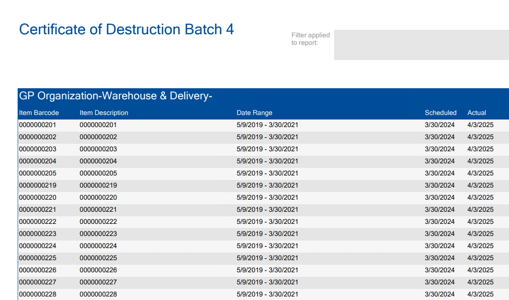 Only items with Actual Destruction Dates are included with the Certificate of Destruction (whether manually entered or automated).