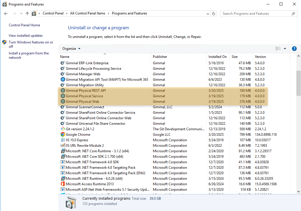 To Uninstall Gimmal Physical, please use the Programs and Features option in the Control Panel to uninstall each component. This will remove aspects of the application except the database.