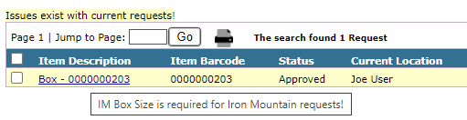 Box records will need to have a current location, an IM Box Size value, a Customer ID, and a District ID before they can be requested for pickup or delivery.