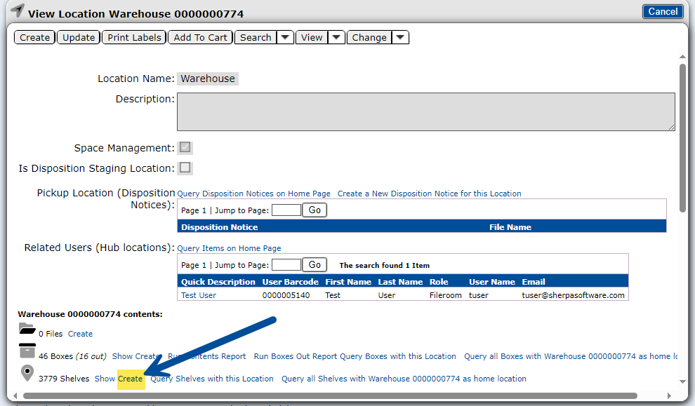 Verify the Shelf record was created in the specified Location.