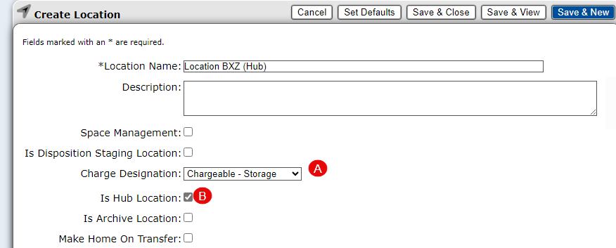The “Default current location” and the “Default home location” should be set to the barcode of a Hub Location that has been designated as a “Chargeable – Storage” Location.