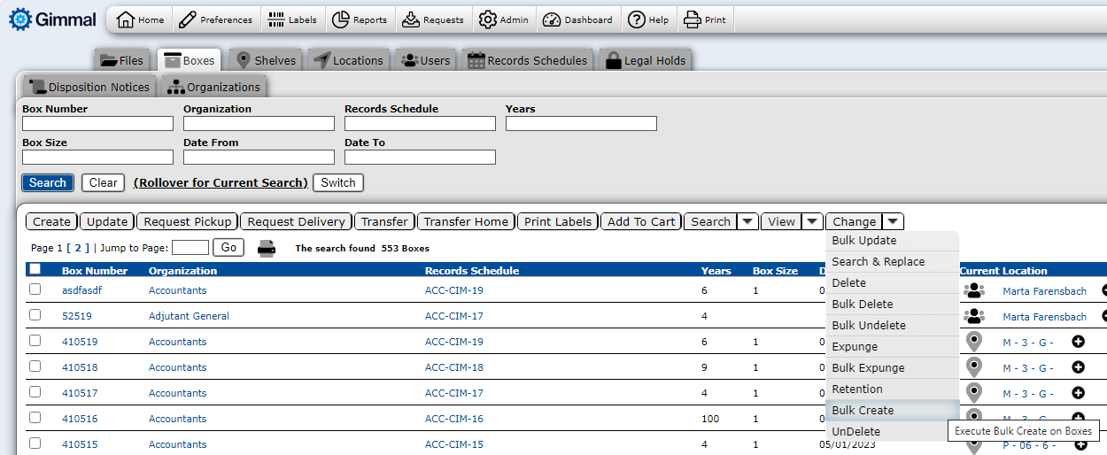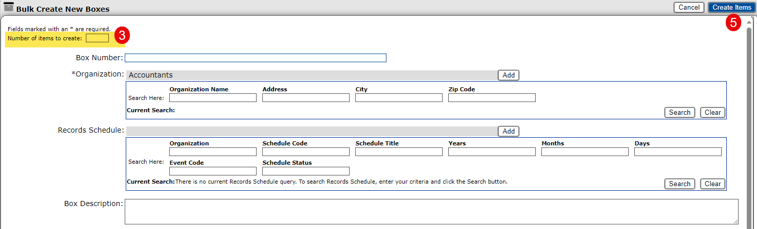 Gimmal Physical supports the creation of multiple records for users who need to add a number of similar items to the application efficiently. Rather than creating multiple individual records that have identical fields, Bulk Create saves time creating multiple items at once via the interface. These records will be identical in detail, except the individual item records will have different barcodes.