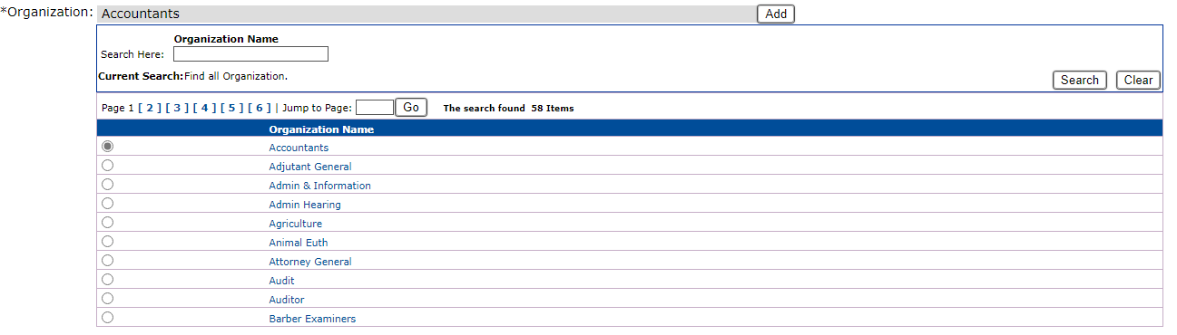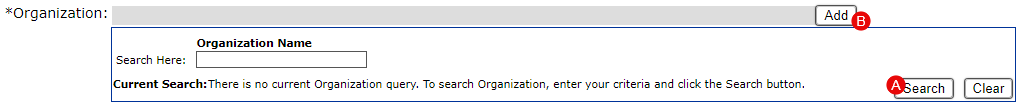 If the option you are seeking is not in the list, and your security profile allows it, you may want to add a value to the list. The ‘Add’ button (B) allows you to do this by opening a creation screen for the data type shown in the field (in this example, Organization).