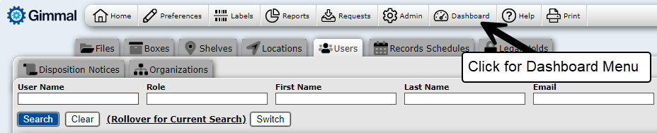 The Dashboard link is found on the Navigation Ribbon. Clicking on this link displays the 'Gimmal Physical Dashboard' screen in a separate browser window.