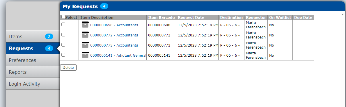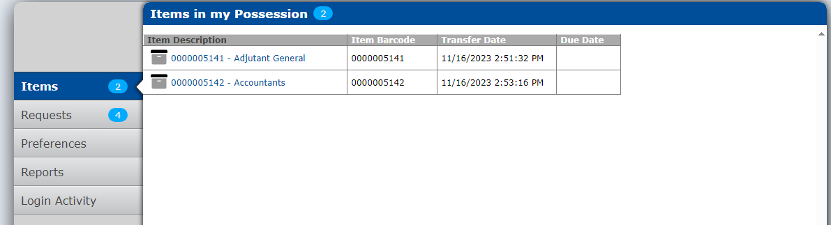 Selecting the Request panel will show all outstanding requests made by the logged in user. This list will include both available and waitlisted items.