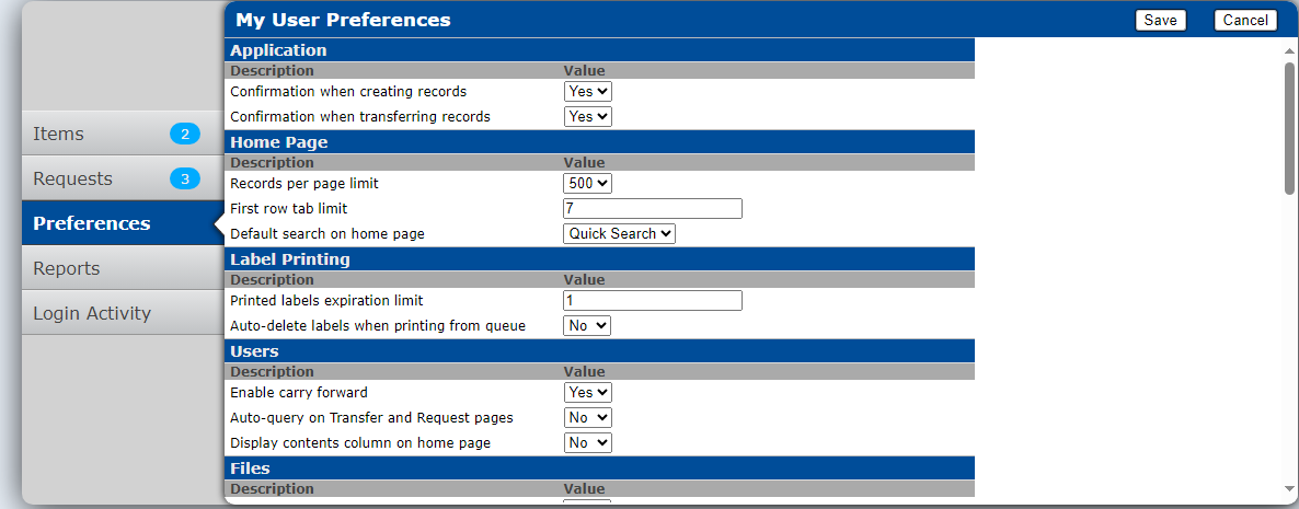 Clicking on the Preferences panel will show the preferences configurable by the logged in user. These preferences can be modified and saved on this screen.