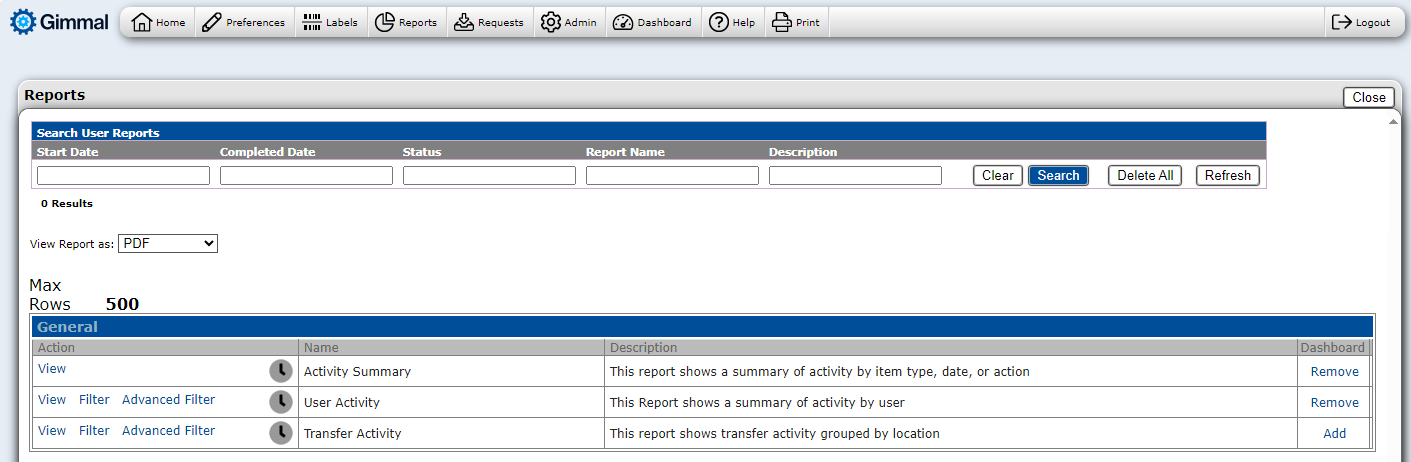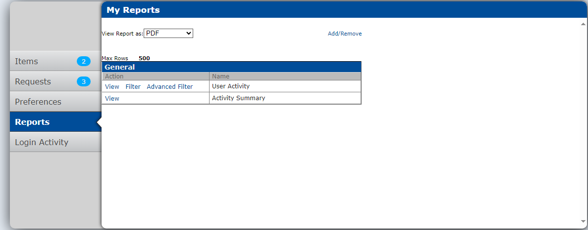 Clicking on the ‘Add/Remove’ link from the Reports panel will open the Reports view which features a listing of reports available to the logged in user.