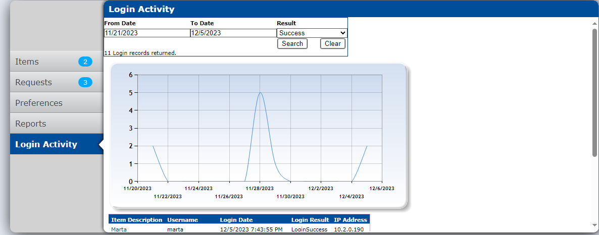 The ‘Result’ drop down box filters the chart accompanying table showing a paginated history of logins for the entire application. Select the option of choice, then click the ‘Search’ button. Click ‘Clear’ to return to the default view.
