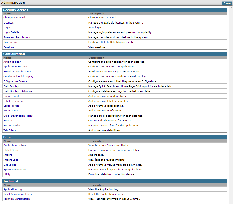 To manage Roles and Permissions click on the Roles and Permissions link under ‘Security Access’.