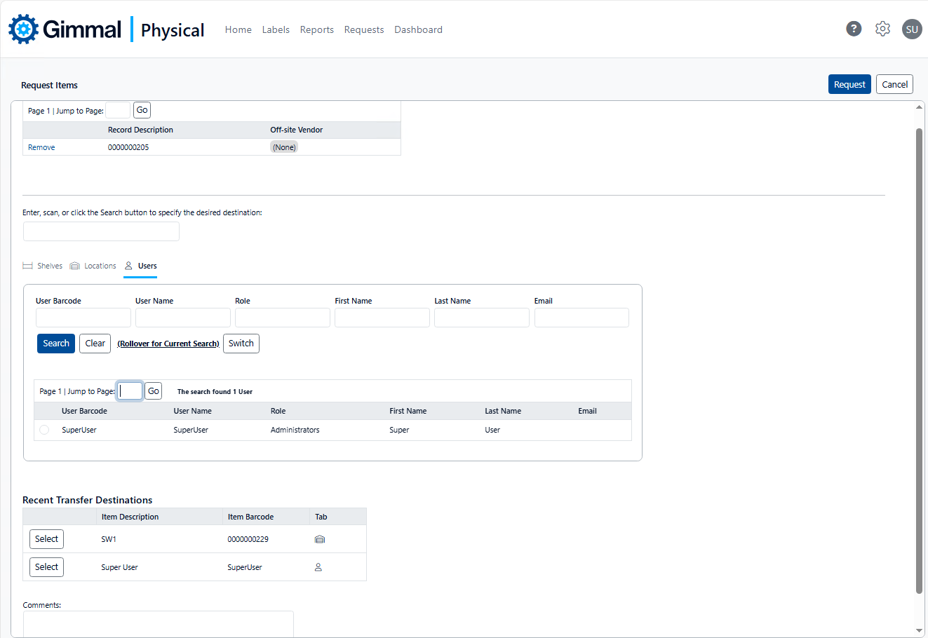 Delivery Requests are typically initiated to request an item to be transferred to a specific user’s location. To submit a delivery request: