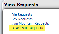 There is an O’Neil Requests page to manage requests for items going to or coming from an O’Neil affiliated Record Center. Click the ‘O’Neil Box Requests’ link to open the View O’Neil Requests page.