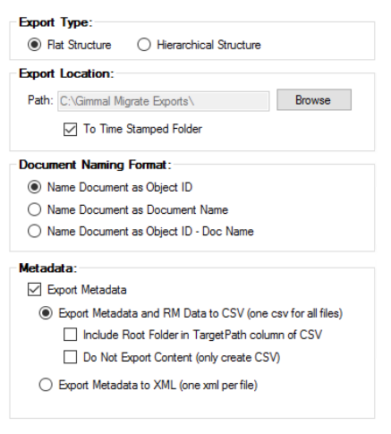 A hierarchical structure only needs to be used if you intend to leave the files on the file share permanently. It recreates the Content Server structure. If you do select this, set the Document Naming Format to Name Document as Document Name or Name Document as Object ID - Doc Name. You can also choose to export the metadata for each file to one XML file per file.