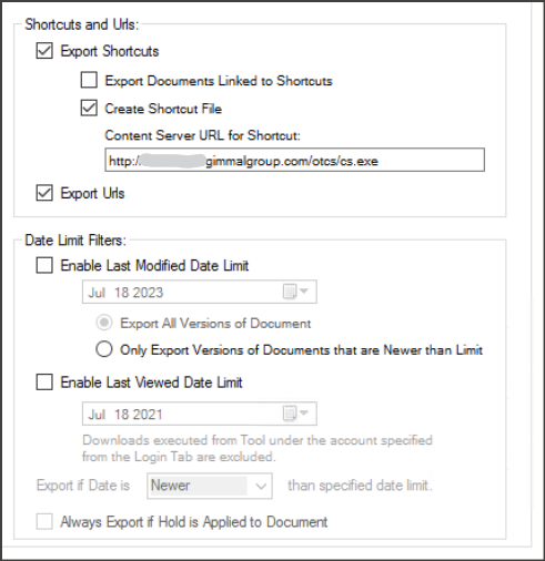 If you have Shortcuts and URL’s in Content Server, you can export these as well. Select Export Shortcuts, click the box for Create Shortcut File and enter the main Content Server URL in the box. If you select the Export Documents Linked to Shortcuts option, it will export a copy of the document for every shortcut that is exported. This could lead to multiple copies of the same document being migrated to SharePoint.