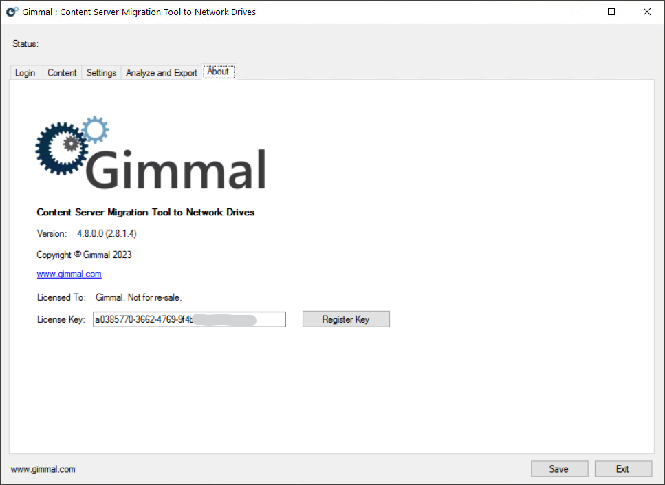 Prior to use, the Export Tool must be registered with a Gimmal provided License Key. To register the Export Tool, enter the key on the About tab of the UI. Registering the Export Tool requires external internet access. If a license is configured for multiple users and instances of the Export Tool, each user will need to register the Export Tool the first time they use it.