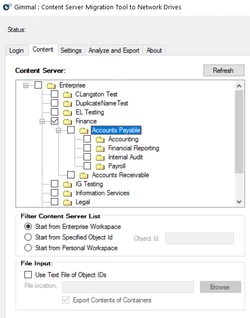 The Content Tab gives you a view of the Content Server repository. When you first click the tab, the Export Tool queries the Content Server and retrieves the top-level structure of the repository, displaying the folder view. If you click any folder, it then queries that part of the structure and displays the sub-folders. For large repositories, this may take a few minutes!