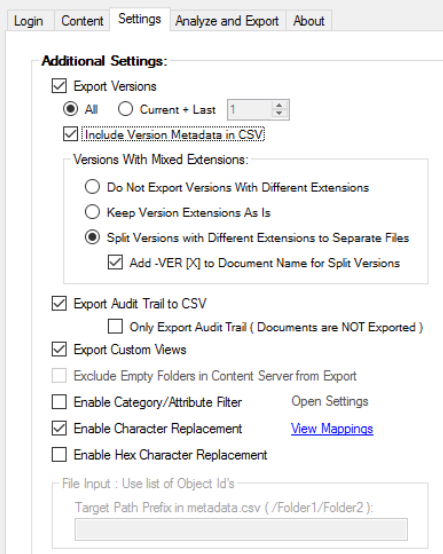 The Login tab is where you will enter credentials for your Content Server environment. The Export Tool logs into your Content Server environment and uses the Web Services API’s to extract the content and metadata.