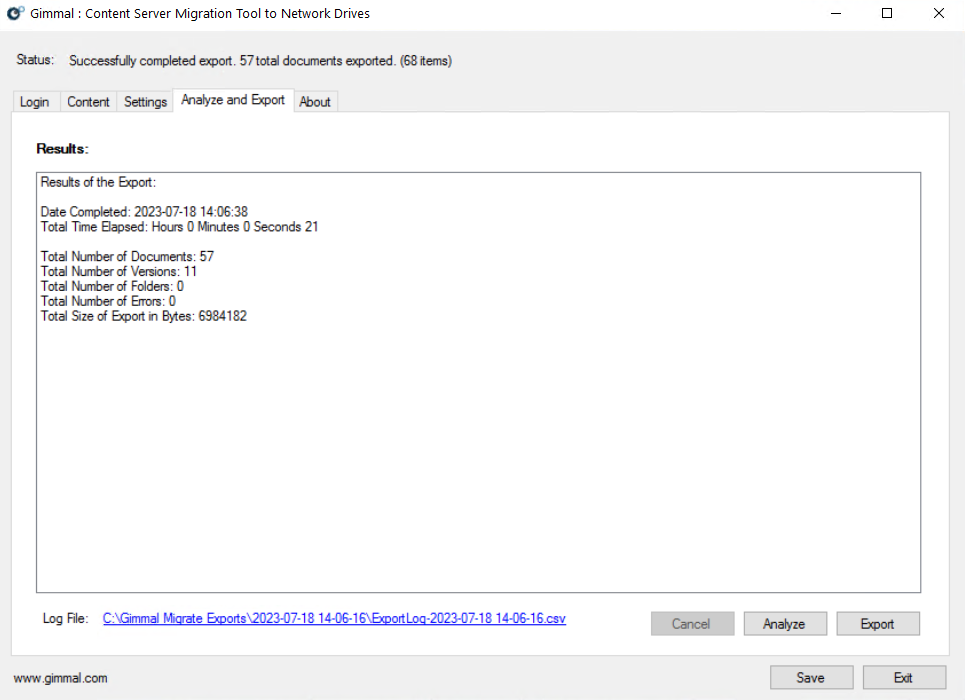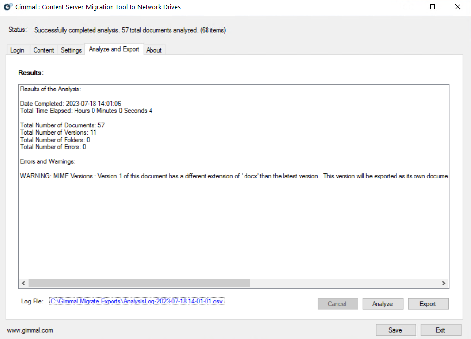 Click Analyze to review your Export job. Any Warnings or Errors will be displayed. A Warning does not prevent the export from running successfully. Any Errors must be addressed before performing the export. A link is provided to the log file created by the Export tool for audit purposes post-migration.