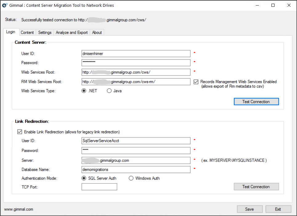 If you are using Legacy Link Redirector, refer to the Credential section of the Gimmal Export documentation. Once you have filled in the data, click the Test Connection button. You should see a Successful status message in the upper left of the screen.