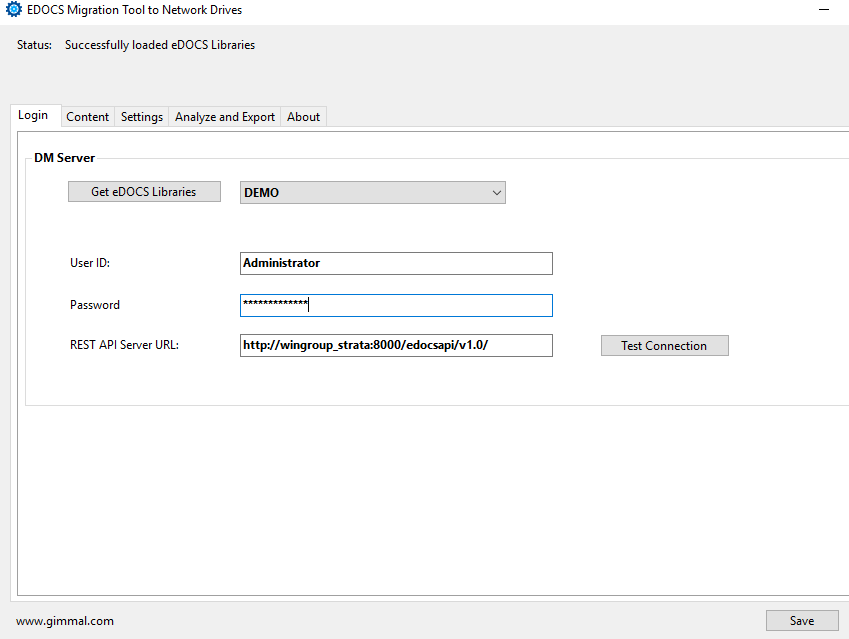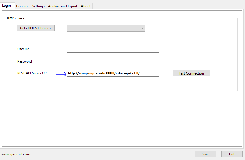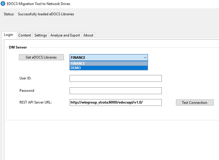 Requires login credentials, eDOCS REST API URL, and Library to access the contents of eDOCS Libraries.