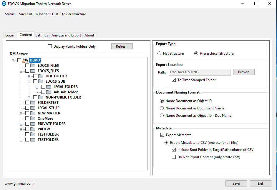 The panel on the right of the ‘Content’ tab allows the user to set the destination export location (local or network drive), the document naming format of exported data from the eDOCS source system, and options for metadata export.