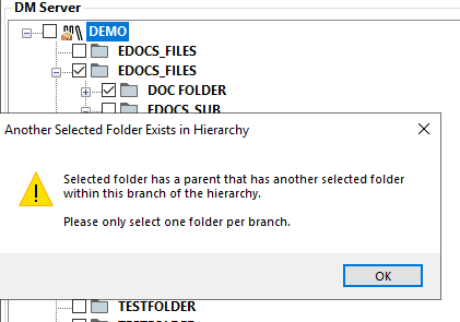When you select a folder, the selected folder and its children will be included in the export. You cannot check the selected folder’s children for exporting; likewise, if you select the child folders, you cannot check their parent folder. If you do so, you will be prompted with a warning message, and the system will correct the ”duplicate” selection: