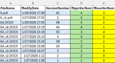 An example of how the eDOCS Major and Minor versions (column C) would be translated to SharePoint automatically by Morae tools. The column in green represents the SharePoint Major versions, and the column highlighted in yellow represents the minor versions in SharePoint.