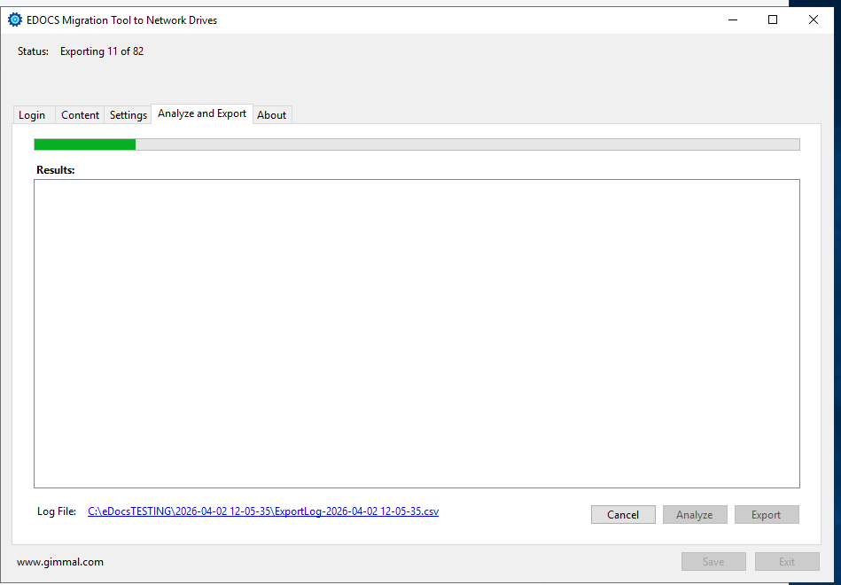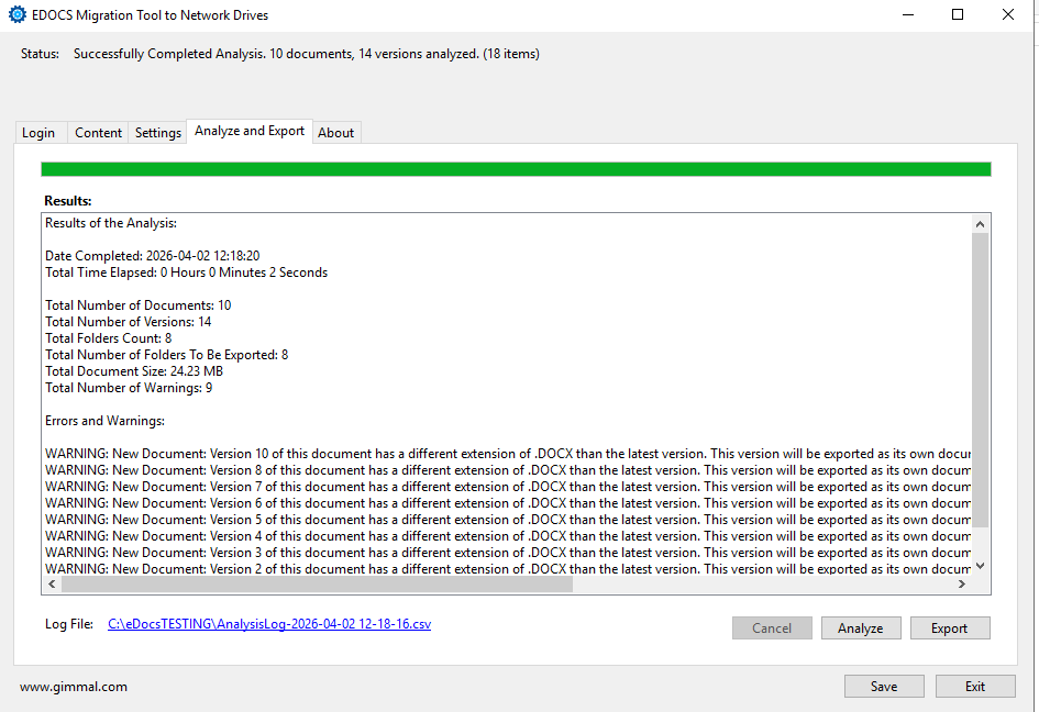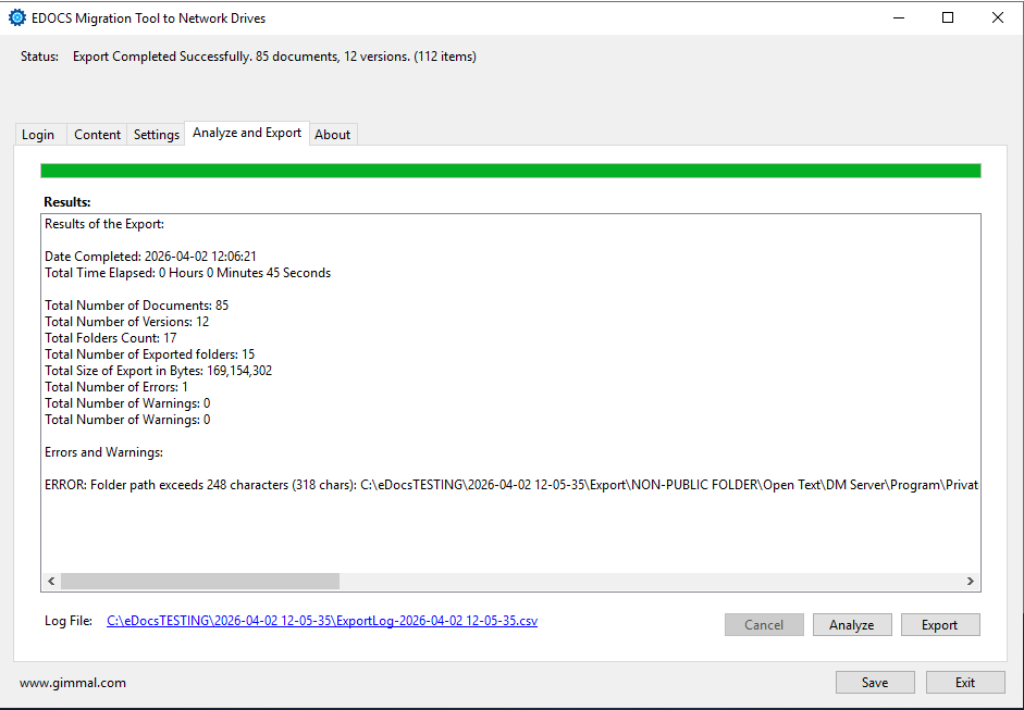 Please note that if the eDOCS environment is down or unavailable during an export, errors will be reported, and an export restart will be required. This tool is not responsible for managing or preventing such outages.