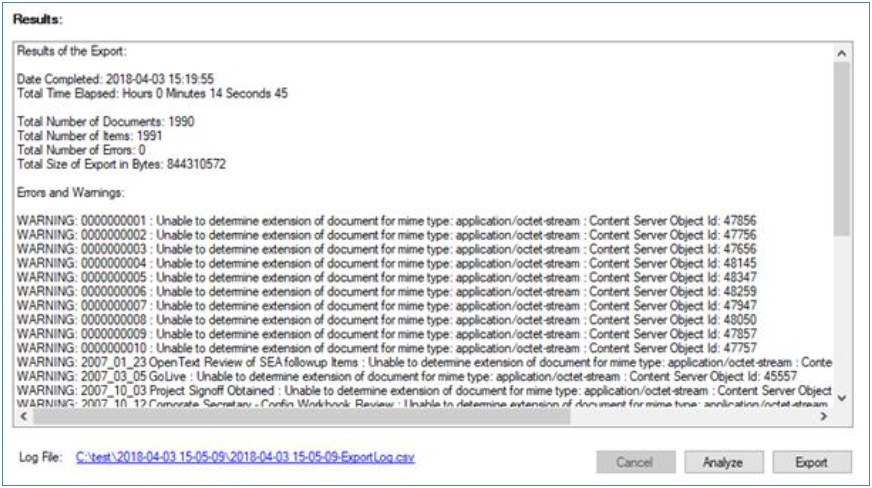 The analyst can review the analysis log to determine if any actions are required to fix issues prior to performing the export