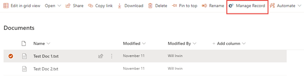 The Gimmal Manage Record button will now appear for documents being managed by Gimmal Records.