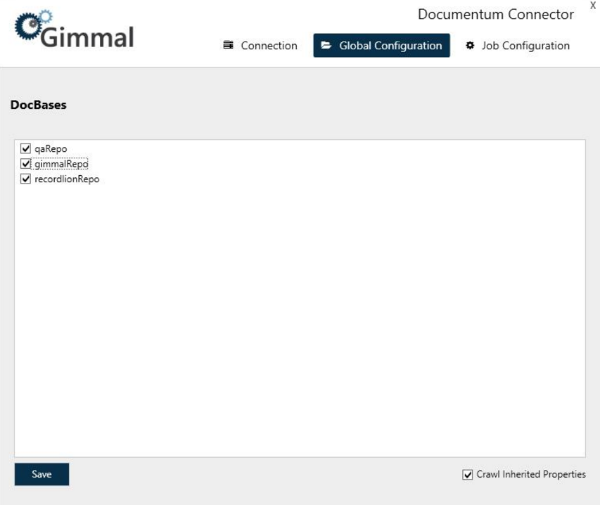 3. Indicate if you want the system to crawl the inherited properties for the selected DocBase(s) by clicking the Crawl Inherited Properties* checkbox in the lower right corner. (Defaults to checked.)