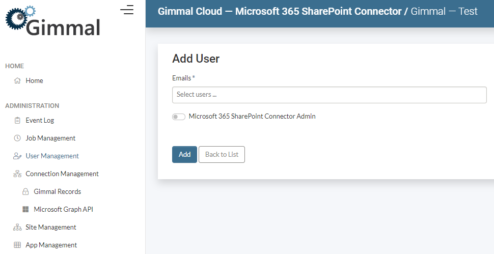 NOTE – to add a user to the Microsoft 365 SharePoint Connector that user must first have access to the Gimmal Cloud tenant hosting the Microsoft 365 SharePoint Connector.