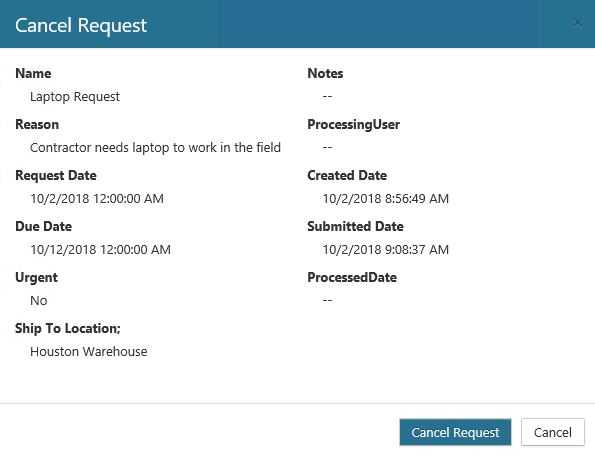 Select Cancel, a confirmation window will open. Click Cancel Request. On the My Requests page, the request still displays, but the Status for the request changes to Canceled.
