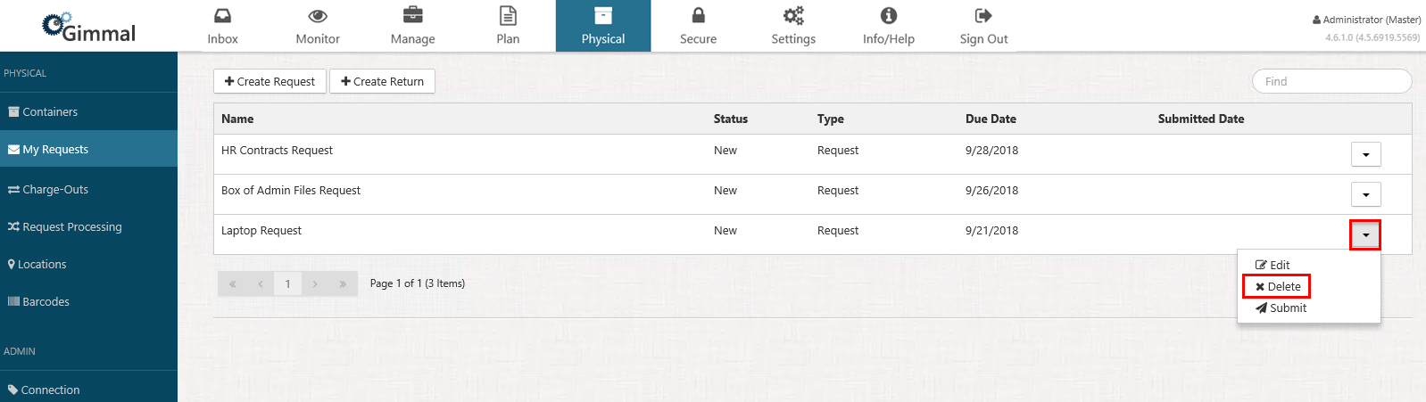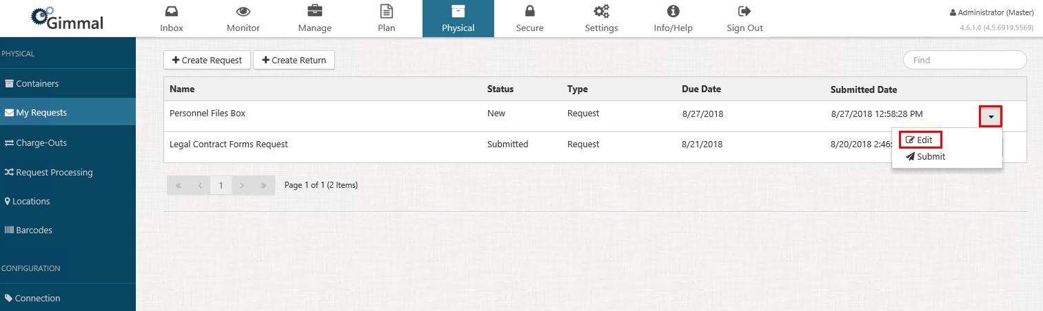 Select Physical from the Main Menu, and then select My Requests from the left navigation menu. The My Requests page displays.