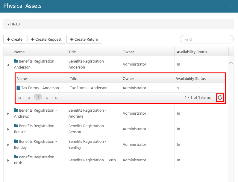 Click the drop-down for the desired container and select the View Assets option. The Physical Assets dialog opens.