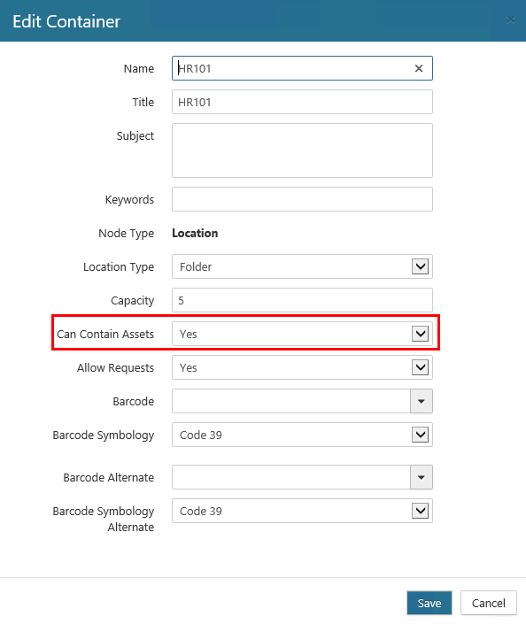 Verify Yes is selected for the "Can Contain Assets" field, and then click Cancel to close the dialog and return to the Containers page.