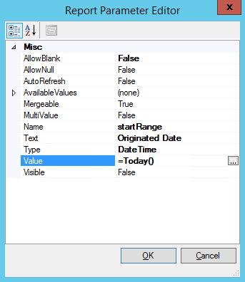 For the Value field, you can hard code a value or expression, or you can define a New Report Parameter. The New Report Parameter will enable the user to enter values for the report parameters when the report is executed. In this example, the user will enter values for the Start Date and End Date.