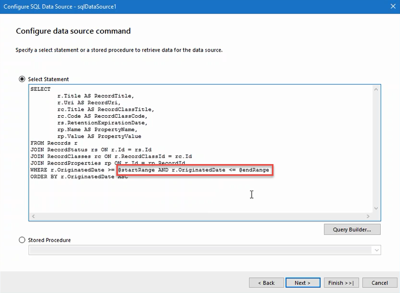 In addition, this sample SQL statement shows a report that will return the record metadata, record classes, and the associated disposition dates when the user selects a range of origination dates.
