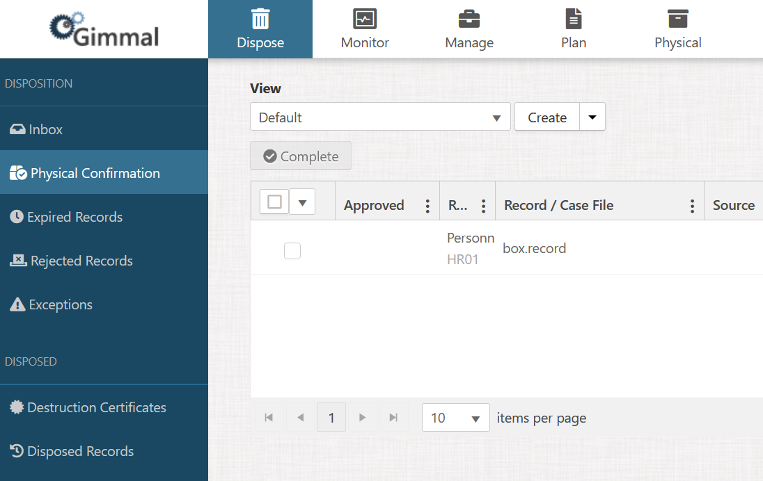 Once the asset has been submitted for disposition, it will create a task in the Physical Confirmation area to be manually completed by a records manager. Goto Dispose → Physical Confirmation to see the Physical Confirmation area.