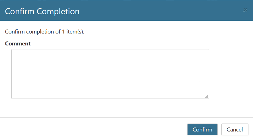 Once there is proof that the asset has been properly disposed of, your organization's record manager will need to confirm it's completion. One or more confirmations can be completed at one time by selecting the checkboxes in the leftmost column of each record. Clicking Complete will display a confirmation window in which you can comment and confirm that the physical record has been destroyed.