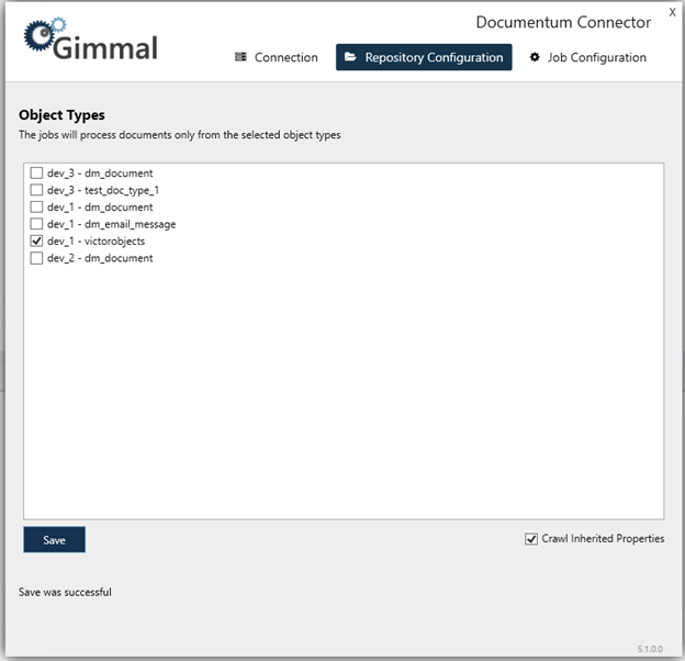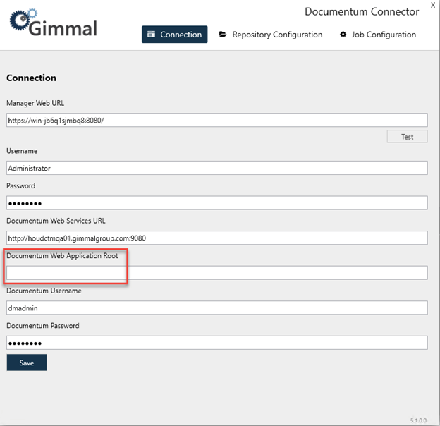 It is highly recommended to not adjust any of the Documentum information in the Connection tab after saving. Changing this setting can result in duplicate records being added.