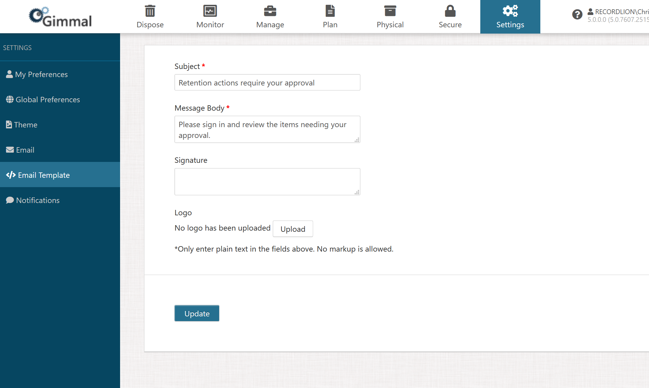 Customize an email template for your Records Management approval notifications by performing the following steps. This will be used when the system sends emails for approvals. An asterisk (*) indicates that the property is mandatory.
