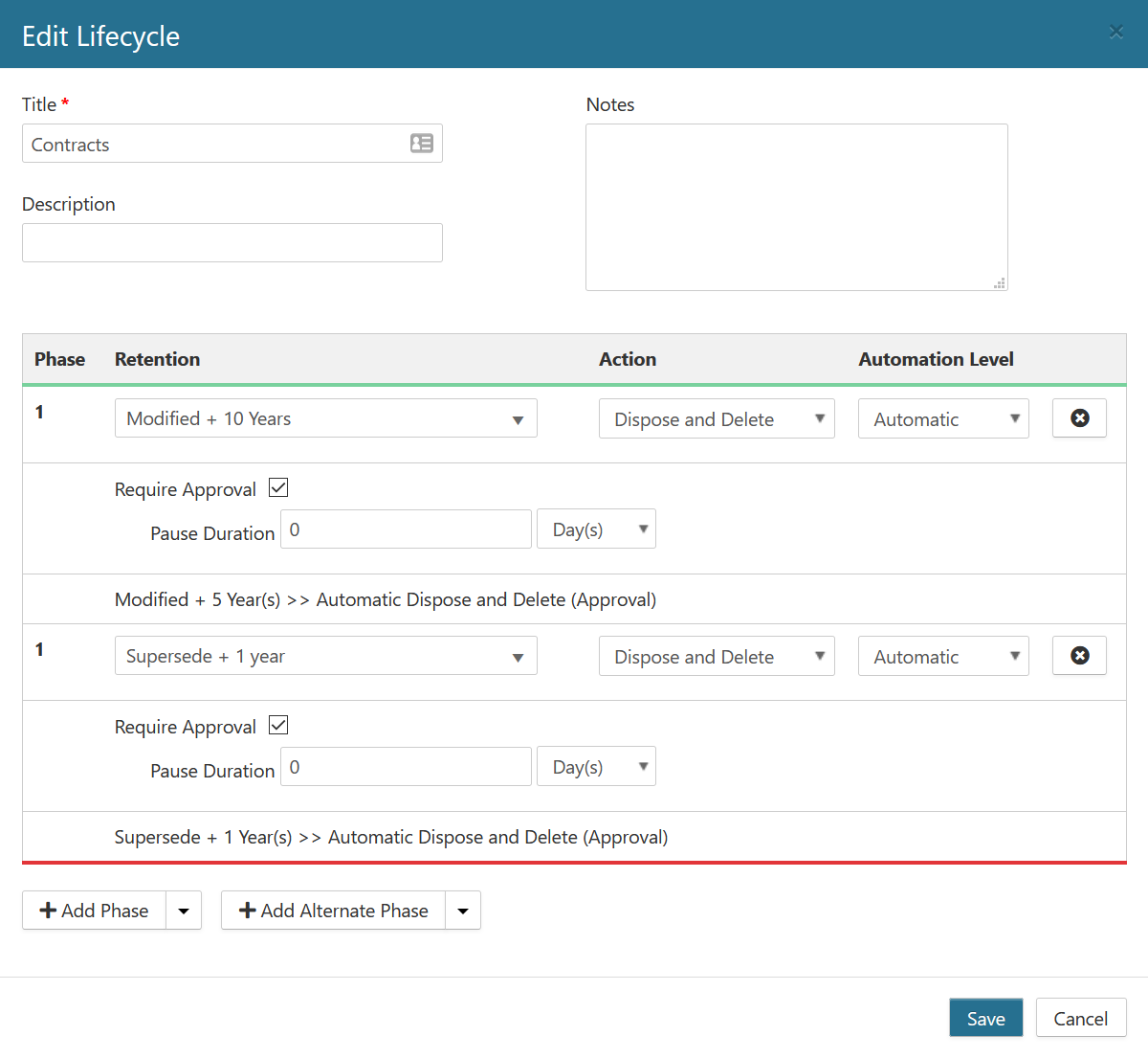 A Lifecycle brings together the existing Triggers and Retentions to define which action should happen to an item at specific points in time. Each of these points in time is represented within a Lifecycle by a Phase. Lifecycles can be assigned to any number of Record Classes which will ultimately determine the retention of records, and how it goes through disposition.