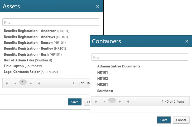 Make your selection, and then click Save. If you moved the asset to another container or to an asset in another container, it will no longer appear on the Physical Assets dialog.