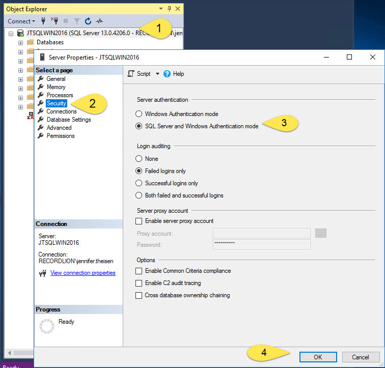 From the left pane, click the Security page, and then select SQL Server and Windows Authentication mode in the Server authentication section. (Note: Windows Authentication mode is selected by default.)