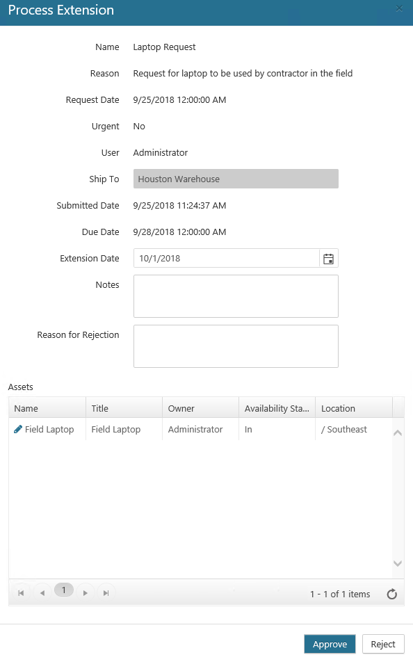 The Process Extension dialog opens, showing the properties associated with the request, as well as the physical asset that was initially requested (under the Assets section). Note that you can right-click on the asset to view its properties.