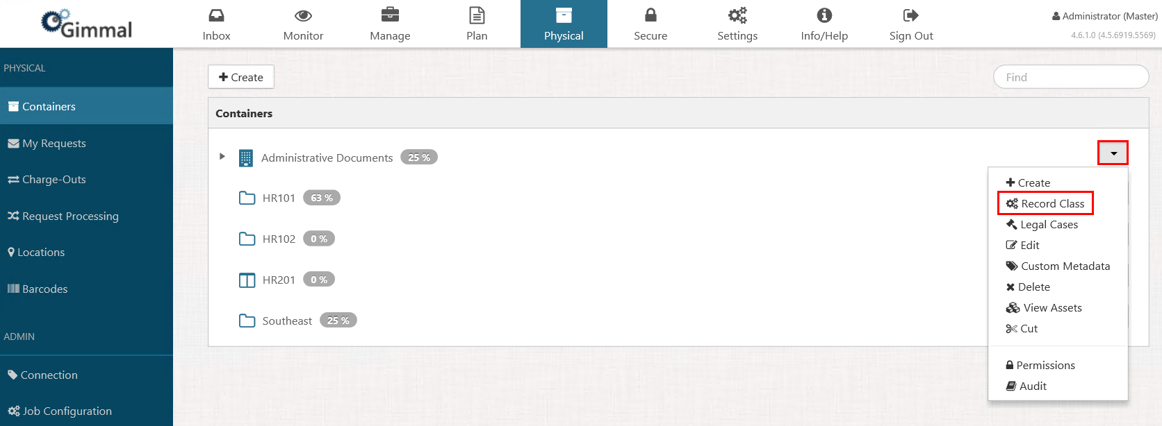 Locate the container you want to associate a Record Class to, and click the drop-down arrow on the right side. The container context menu displays. (The drop-down options you see may vary, depending on your permissions.)