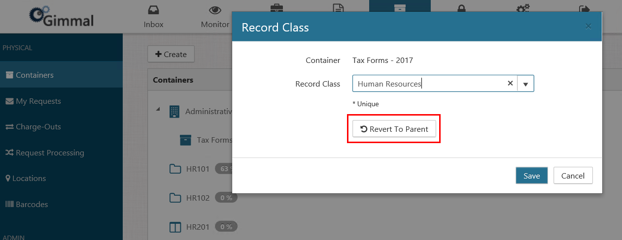 Record Class inheritance is the process by which a child container inherits the record class of its parent container. An authorized user (as described above) can break this inheritance and manually set a separate record class for a child container. If desired, you can revert the child container's record class back to the parent's record class.