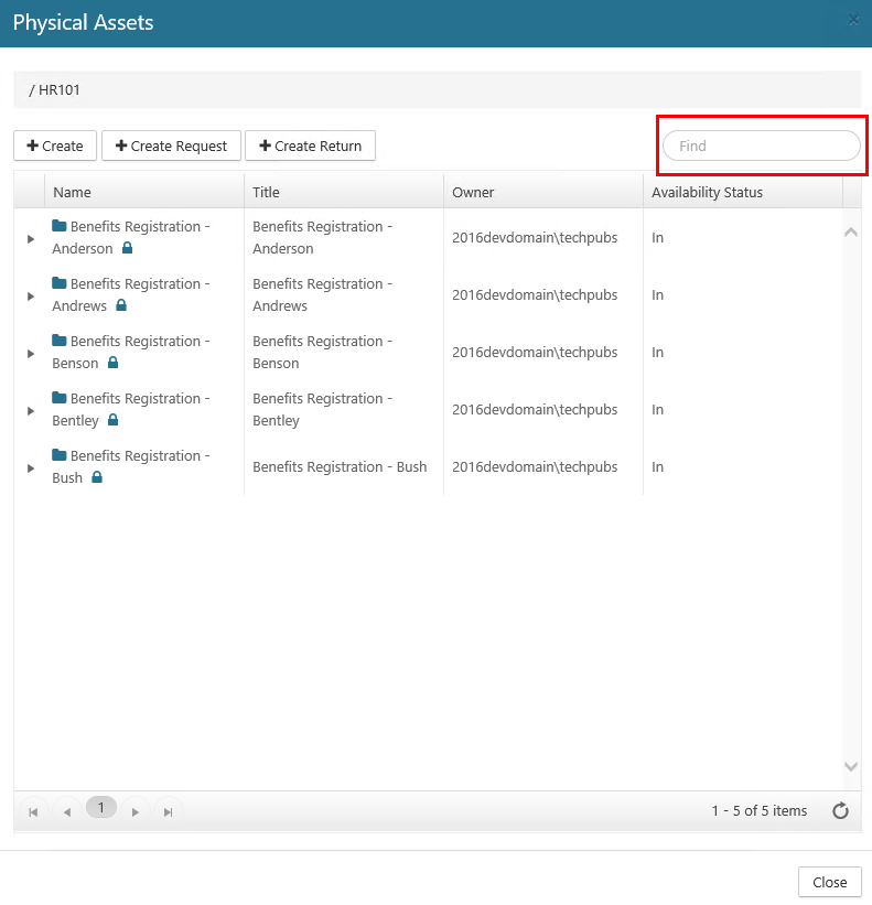 4. In the Find field in the upper right corner, starting by entering the first few characters of the asset name or title until the results are filtered to match the characters you enter, and the desired asset(s) display.