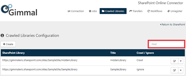 Existing overrides can be viewed and managed through the Crawled Libraries tab. The full list of overrides for all registered sites is shown and can be searched by Title or Url using the upper right Find search box (in the red rectangle pictured below).