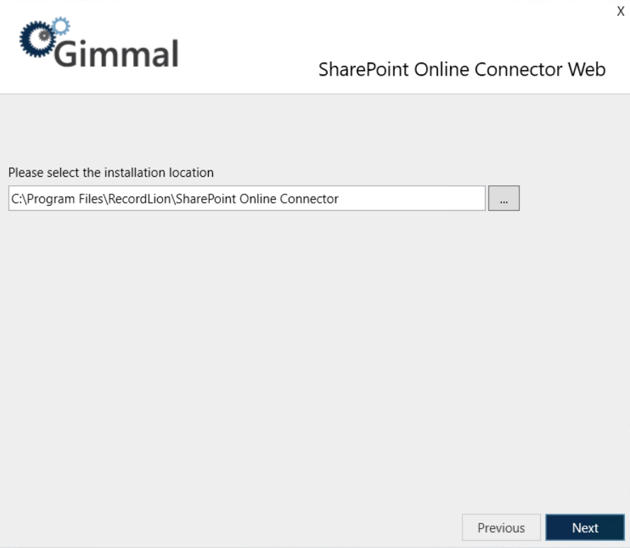Leave the installation path as the default, or to change it, click the ... icon next to the installation location field, select the desired installation location and then click Next. The IIS Settings screen displays, where you will configure the IIS settings for the SharePoint Online Connector Web.